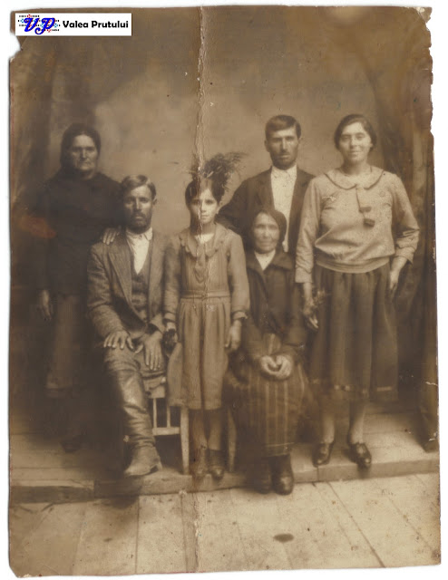 O amintire prețioasă din perioada interbelică: o familie din Costiceni, județul Hotin. Fotografia surprinde șase membri, fiecare purtând în privire și în ținuta lor spiritul și simplitatea vieții de la țară din nordul Basarabiei.