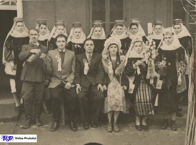 Fotografia surprinde o nuntă tradițională din satul Marșenița, desfășurată în anul 1957. În centrul imaginii se află mirele și mireasa, înconjurați de nașii de cununie și druște. Imaginea documentează tradițiile de nuntă din nordul Basarabiei în anii '50, ilustrând contrastul între portul popular feminin și ținuta modernă masculină.